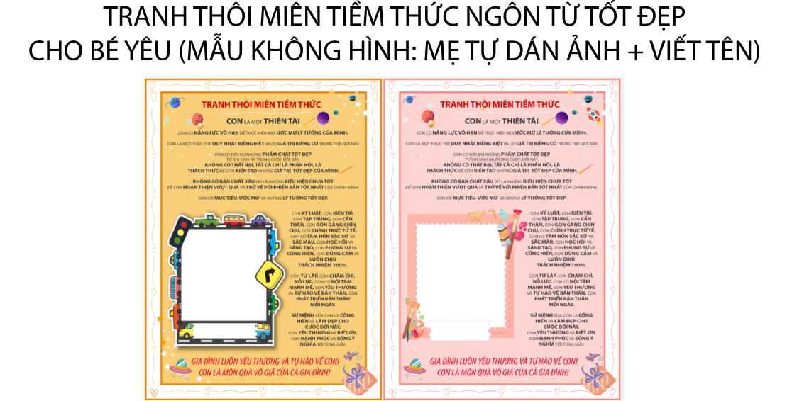 Sản phẩm đã thiết kế sẵn nội dung lời khẳng định tích cực, chừa khung trống để gia đình dán ảnh và ghi tên bé theo ý muốn.