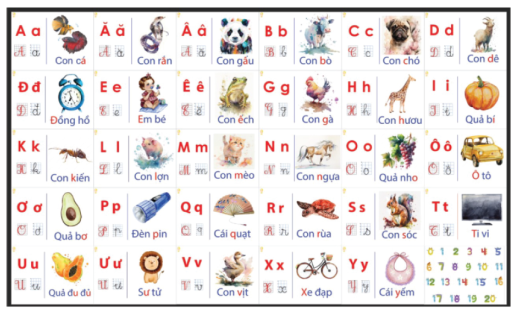 Bảng chữ cái tiếng Việt kèm hình minh họa, giúp trẻ nhận diện mặt chữ và làm quen đọc viết dễ dàng.