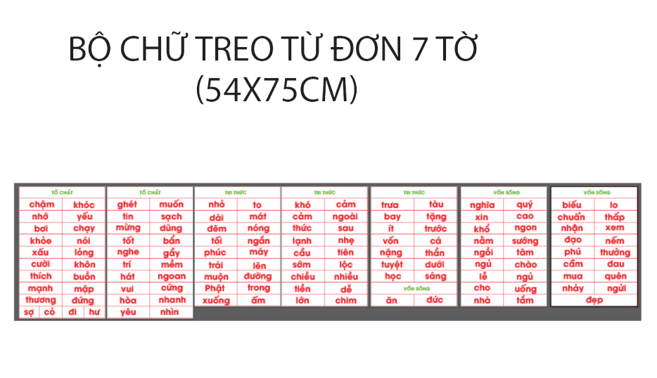Bộ gồm 7 tờ ghép thành bảng 54x75cm, tổng hợp nhiều từ đơn theo nhóm: