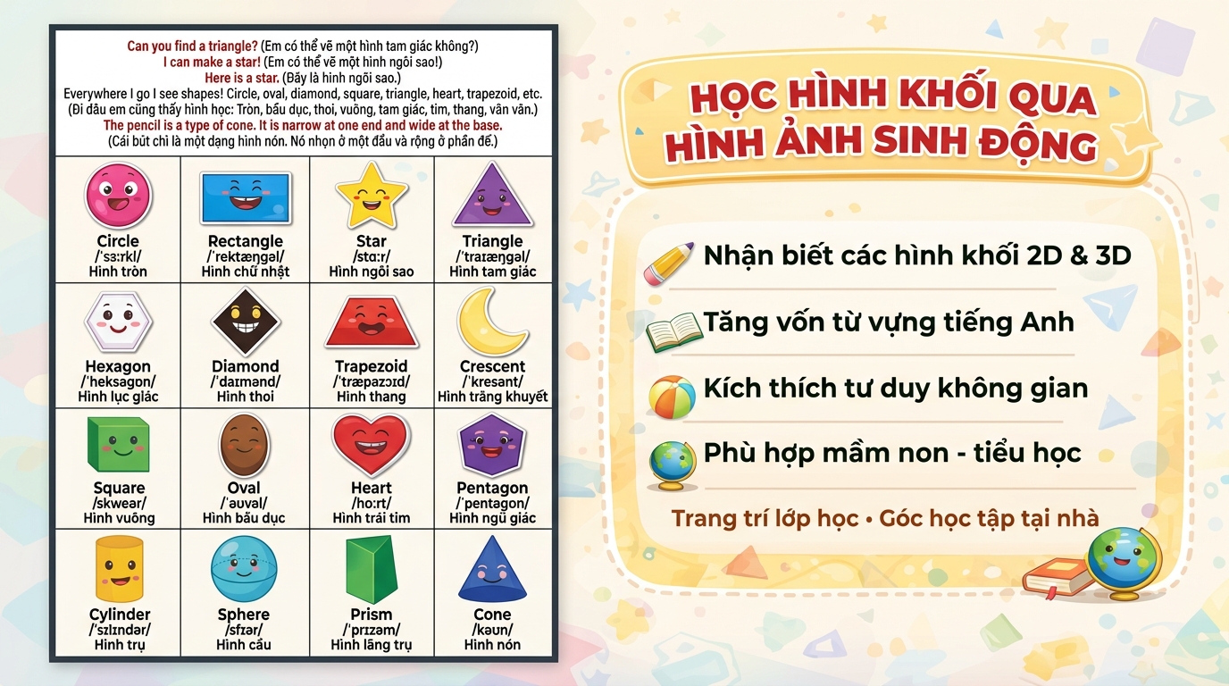 Poster tổng hợp các hình khối cơ bản và nâng cao như: hình tròn, vuông, tam giác, chữ nhật, ngũ giác, lập phương, trụ, nón… kèm tên gọi tiếng Anh và tiếng Việt.